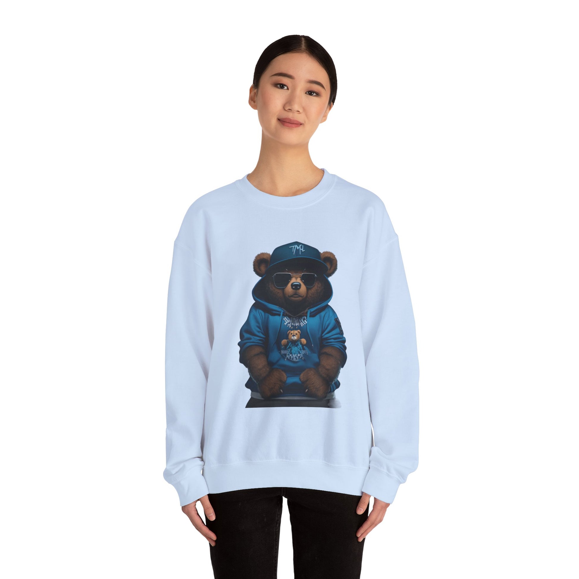 A cozy, mid-weight crewneck sweatshirt featuring a detailed, street-style bear illustration on the front. Soft yet sturdy, the sweatshirt blends breathable cotton with durable polyester for everyday wear that holds up wash after wash. The classic fit and ribbed collar keep the silhouette clean while double-needle stitching reinforces high-stress seams. Subtle production details — tear-away neck label, OEKO-TEX certified dyes, and ethical US cotton sourcing — make this piece comfortable and conscientious. Wear it layered for cool evenings or alone as a statement hoodie-alternative that brings a touch of playful urban edge to casual outfits.