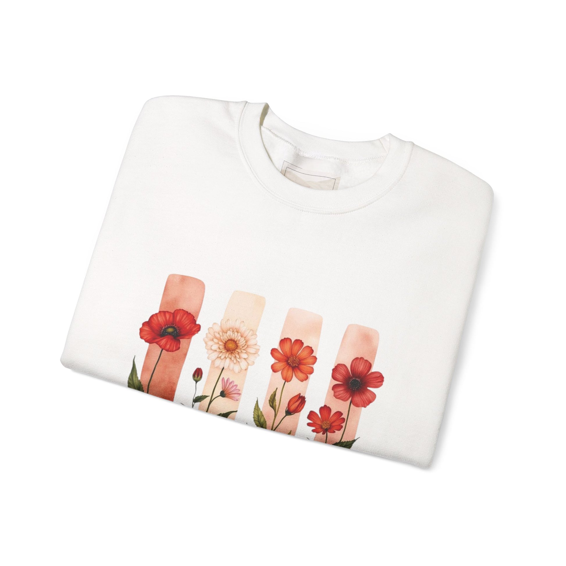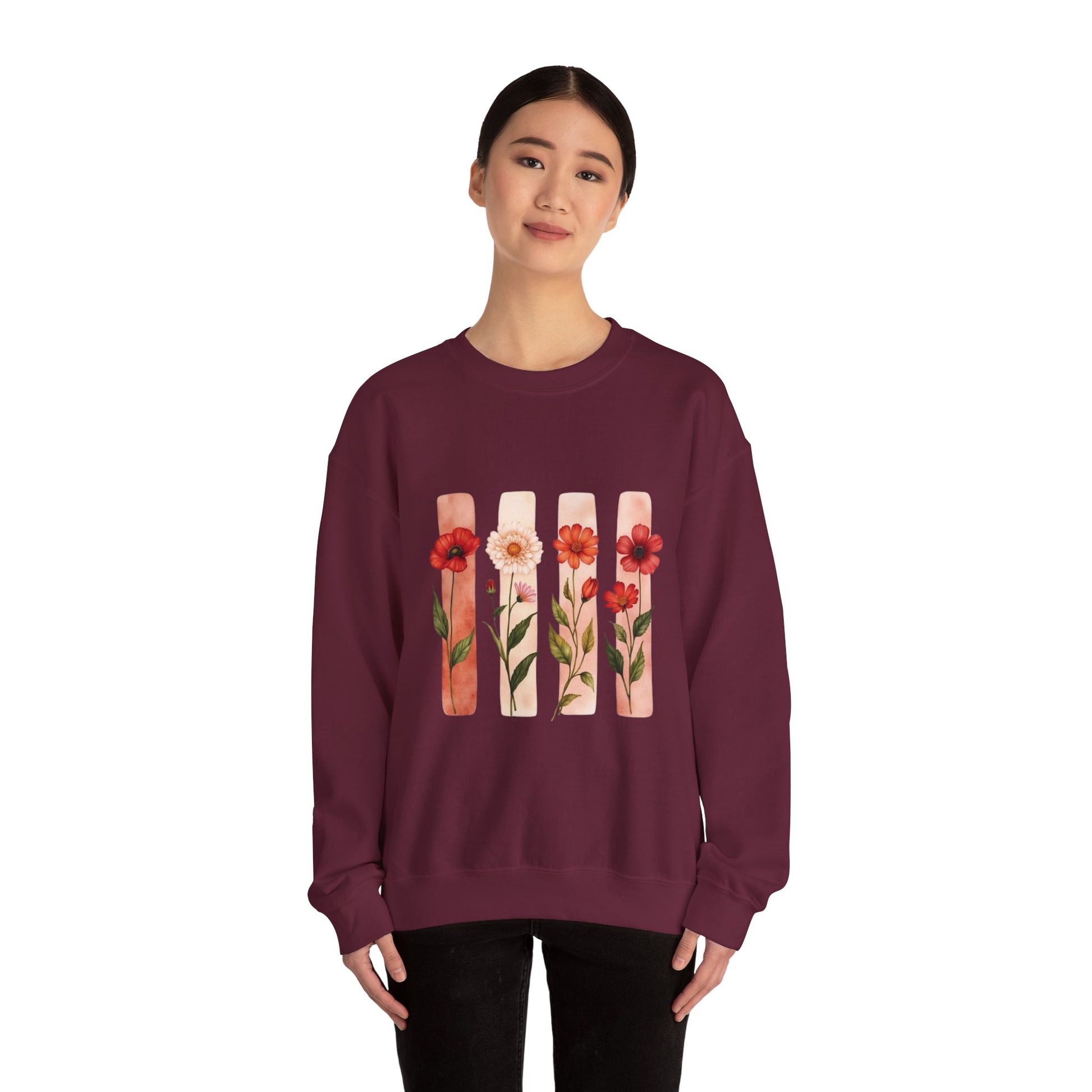 Soft, calming, and effortlessly elegant — this vintage floral strip sweatshirt is made for those who love subtle beauty and everyday comfort. The design features four vertical watercolor panels, each showcasing delicate poppies and wildflowers in warm reds, peaches, and gentle greens, creating a balanced and artistic botanical look.